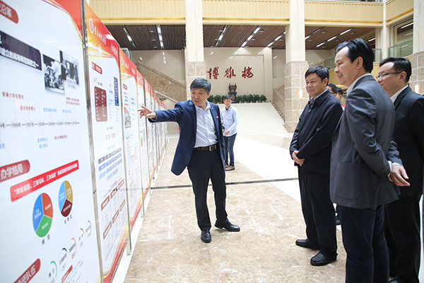 杜占元一行首先來到博雅樓。在一樓大廳,周澤揚校長介紹了我校學科建設工作的相關情況。杜占元一行在聽取匯報的同時,觀覽了擺放于此的系列展板,對我校的學科建設、科研研究、人才培養、服務社會等方面的工作進行了詳細了解,尤其對數學、生物學、中國語言文學、考古學等學科的建設情況作了深入的調研。