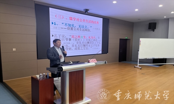 10月21日上午,江蘇省儒學(xué)學(xué)會(huì)會(huì)長(zhǎng)、南京大學(xué)李承貴教授,應(yīng)文學(xué)院“精是講堂”邀請(qǐng),在重慶師范大學(xué)匯賢樓113報(bào)告廳舉辦了題為“儒學(xué)的生活智慧”的學(xué)術(shù)講座。講座由文學(xué)院強(qiáng)中華教授主持。文學(xué)院部分教師及中國(guó)古代文學(xué)、文獻(xiàn)學(xué)、文藝學(xué)、漢語(yǔ)言文字學(xué)、語(yǔ)言學(xué)及應(yīng)用語(yǔ)言學(xué)、學(xué)科教學(xué)(語(yǔ)文)專業(yè)的研究生聆聽(tīng)講座。