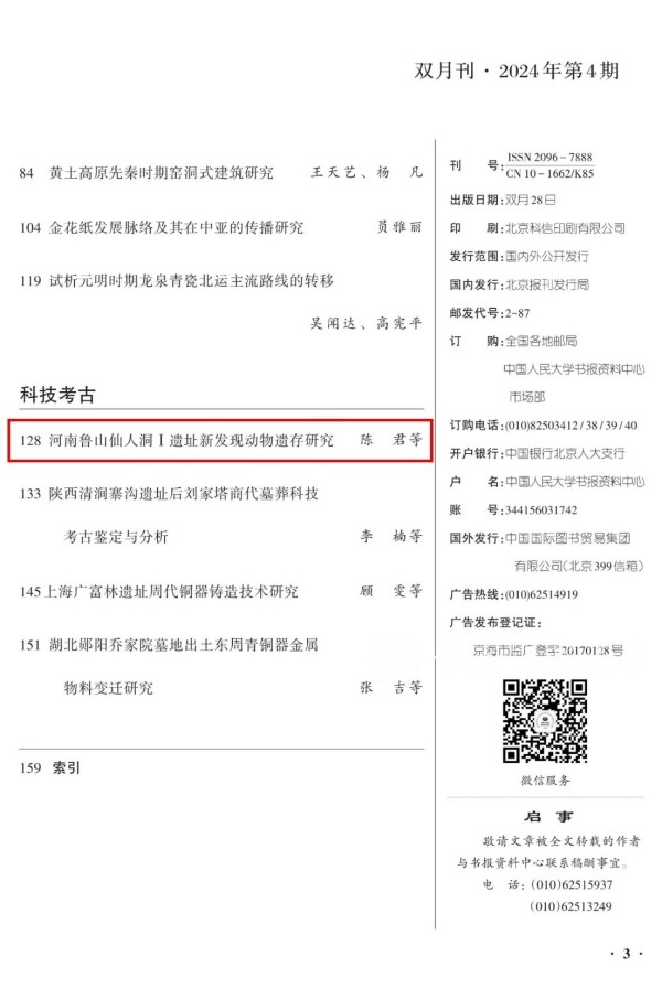 近日,歷史與社會學院教師陳君發表在《華夏考古》2024年01期的論文《河南魯山仙人洞Ⅰ遺址新發現動物遺存研究》被中國人民大學書報資料中心復印報刊資料K6《考古學》2024年04期全文轉載。