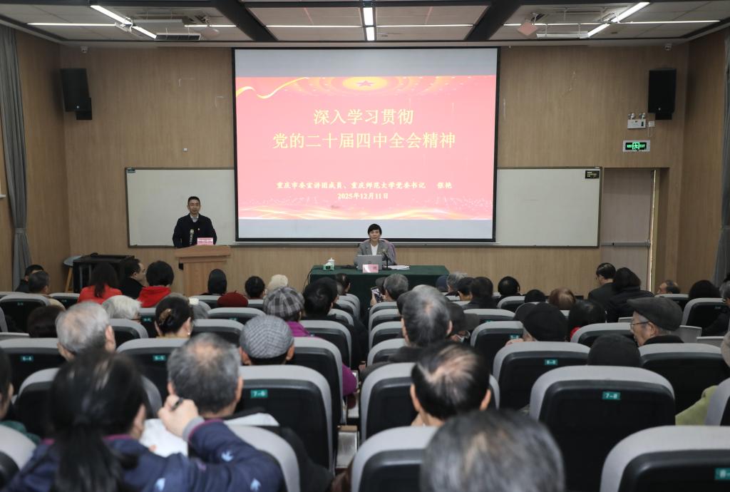 12月11日上午,學校黨委書記張艷到沙坪壩校區向離退休老同志宣講黨的二十屆四中全會精神。副校級干部陸遠權主持宣講報告會。